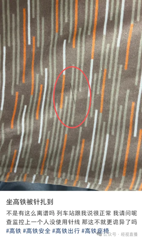 10月25日,有网友发帖称,乘坐高铁时被座椅上的拈花针扎到,且查询监控发现上又名乘客未使用针线。